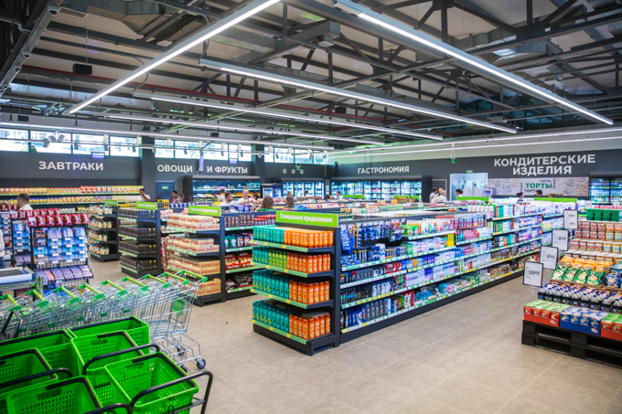 Помещение филиала создает благоприятную атмосферу для совершения покупок. Впервые применена высота полки 1,4 метра – ниже уровня глаз, что позволяет охватить весь периметр супермаркета и легко найти необходимый товар или отдел. Использована функциональная и лаконичная система освещения, отвечающая европейским стандартам. Благодаря приятному для глаз свету, пребывание в магазине стало более располагающее к покупкам. Также плюсом является горизонтальная выкладка товаров, которая позволяет акцентировать внимание покупателей на линии нужных брендов и даёт возможность ознакомиться с представленным ассортиментом.