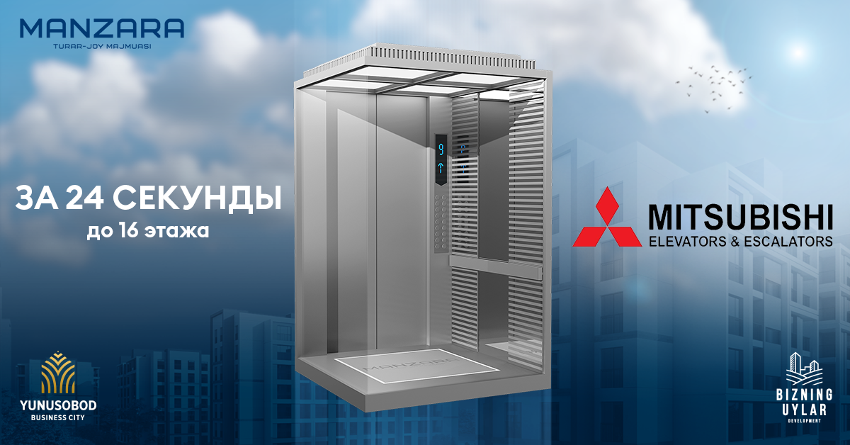 Пассажирский лифт является обязательным элементов оснащения любого многофункционального здания. Его устройство обеспечивает возможность оперативного, комфортного и безопасного подъема и спуска пассажиров, и грузов на нужный этаж. Учитывая высотность жилых домов в комплексе Manzara - 9-ти, 13-ти и 16-ти этажные здания, компания Bizning Uylar Development выбрала в качестве поставщика подъемной лифтовой системы компанию Shanghai MITSUBISHI LEHY-III.
