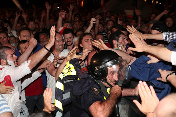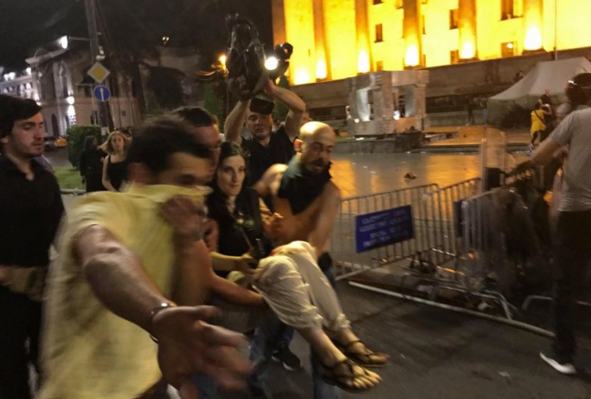 Участники акции, в свою очередь, забрасывали полицейских бутылками и отнимали у них щиты. В столкновениях пострадали десятки людей. Министерство здравоохранения Грузии сообщило о 69 пострадавших. При этом оно утверждает, что более половины из них — полицейские.