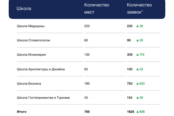 На официальном сайте университета уже размещена таблица с количеством кандидатов на место по каждой школе. Она обновляется ежедневно, чтобы абитуриенты и родители могли видеть актуальную конкурсную ситуацию.