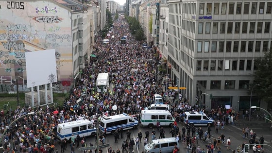 Издание передает, что на центральной улице Фридрихштрассе собралось около 18 тысяч человек, это одна из крупнейших акций подобного рода за последние несколько лет. Митингующие критикуют политику властей относительно карантинных мер.