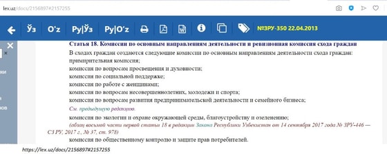 Наделение министерства подобным правом прямо нарушает положения статьи 3 закона «Об органах самоуправления граждан» («Самоуправление граждан — гарантируемая Конституцией и законами Республики Узбекистан самостоятельная деятельность граждан по решению вопросов местного значения исходя из своих интересов, исторических особенностей развития, а также национальных и духовных ценностей, местных обычаев и традиций») и статьи 8 этого же закона («Органы самоуправления граждан не входят в систему органов государственной власти и осуществляют предоставленные им законодательством полномочия в пределах соответствующей территории»).