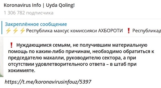 На том же совещание президент подчеркнул: «Почему они [председатели и другие работники махаллинского комитета – прим.авт.] должны оставаться в стороне в такой сложной ситуации? Каково состояние населения, кто и в каком доме болен, у кого какой уровень достатка, кто нуждается в помощи, а кому нужен врач - об этом на низовом уровне никто не знает так хорошо, как представители махалли».
