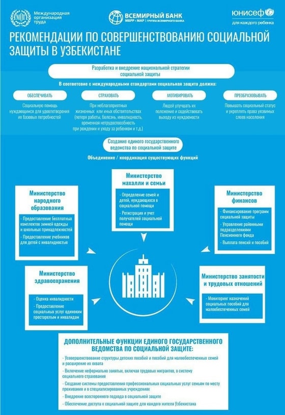 В отчёте «Оценка системы социальной защиты в Узбекистане», подготовленным Международной организацией труда, ЮНИСЕФ и Всемирным банком, говорится: «В стране нет официально принятого определения социальной защиты, нет и специального учреждения для разработки, координации и управления различными программами. Социальная защита раздроблена между министерствами и другими учреждениями, и ни одно из них не несёт общей ответственности за координацию или интеграцию различных мер и мероприятий».
