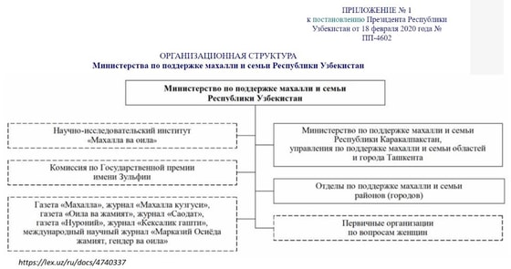 А уже 18 февраля 2020 года был принят указ президента о создании Министерства по поддержке махалли и семьи. В структуре министерства образовывается Научно-исследовательский институт «Махалла ва оила». А Комитет женщин Узбекистана, Республиканский совет по координации деятельности органов самоуправления граждан и территориальные отделения фонда «Нуроний» – упраздняются. Их функции были возложены на подразделения создаваемого министерства.