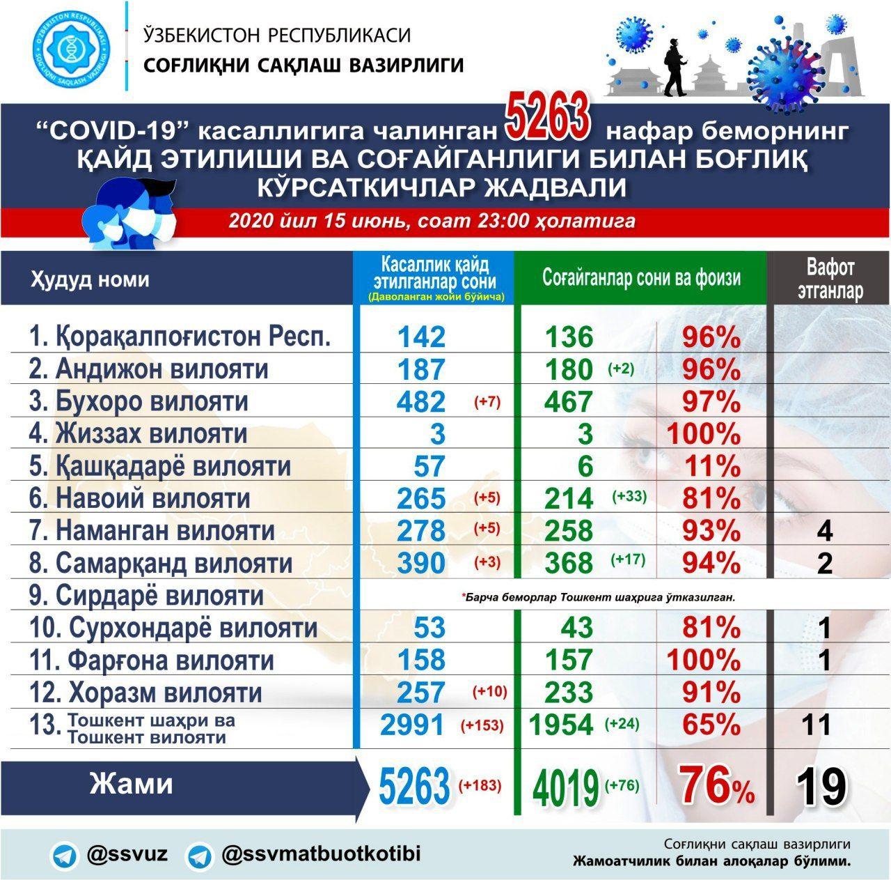 В Узбекистане за один день зафиксировано 183 новых случая заражения коронавирусной инфекции. По состоянию на 23:00 15 июня прибавилось еще 109 новых случаев. Таким образом, общее количество инфицированных составило 5263 человек.