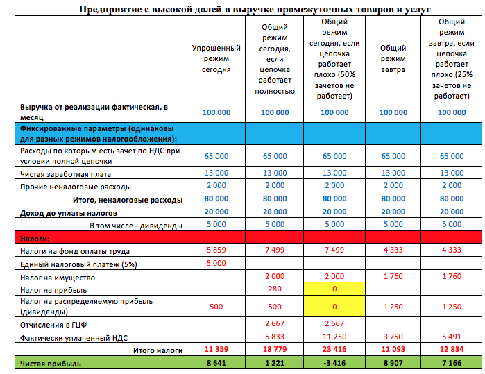 Далее. Чем могут предприятия отличаться друг от друга? Мы решили, что главные различия лежат в плоскости трех основных показателей: доле в валовой выручке а) промежуточных товаров и услуг (которые не входят в добавленную стоимость и по ним могут осуществляться зачеты при уплате НДС), б) фонда оплаты труда, в) получаемых предпринимателем дивидендов. Поэтому мы построили три модели влияния перехода на общеустановленный режим для предприятий с разной долей указанных параметров в выручке.