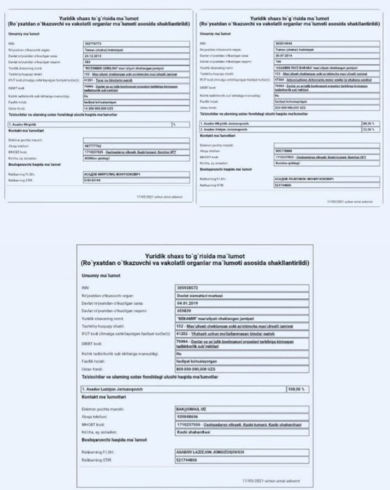 В тендере участвовали 3 фирмы: ООО «БЕКАМИР» (Руководитель и учредитель - Асадов Лазизжон Джонкулович), ООО «РУЗИМБЕК КУРИЛИШ» (Руководитель и учредитель - Асадов Мирголиб Джонкулович) и ООО «АСАДБЕК ФАЙЗ БАРАКА» (Руководитель - Асадов Лазизжон Джонкулович, учредители - Асадов Мирголиб Джонкулович и Асадов Азизжон Джонкулович).