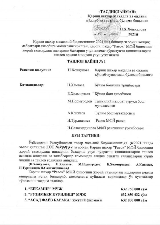 Repost обратился в пресс-службу управления по поддержке махалли и семьи города Карши для получения комментария. В управлении сообщили, что они не занимаются проведением тендера, а их руководительница просто подписала то, что ей принесли.