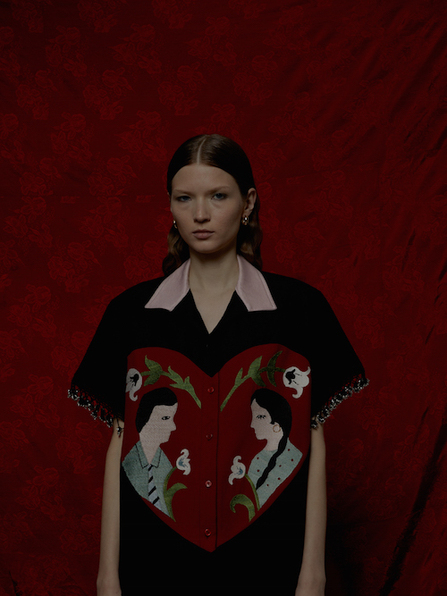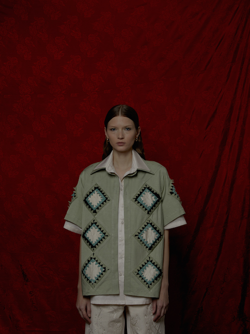 Еще использовала курок — узбекский пэчворк. Скоро выпущу коллекцию шоперов, которую мне собирала из лоскутков 80-летняя бабушка. На многих вещах встречаются бельбоки, мужские поясные платки — ведь коллекция о сильных женщинах. Вышивки на рубашках отсылают к наивным вышивкам в Узбекистане в 1970-е годы: девушки делали их, вдохновленные индийскими фильмами о любви. Несмотря на наивность вышивки, производство такой рубашки непростое. Материал сначала ткут на ручных станках, затем красят ткань и нитки для вышивки; отдельно кроится сердце под вышивку, затем художница переносит рисунок с бумаги на ткань, делается вышивка в виде сердца — все собирается на производстве, низ и рукава изделия обвязываются бисером. А производство рубашки с квадратами вообще убийственно трудное. Чтобы сделать эти маленькие треугольники, сначала кроили крошечные квадраты из шелка, потом складывали их несколько раз и пришивали. Каждый треугольник заутюживается и пришивается отдельно. Это самая сложная коллекция за мою карьеру.