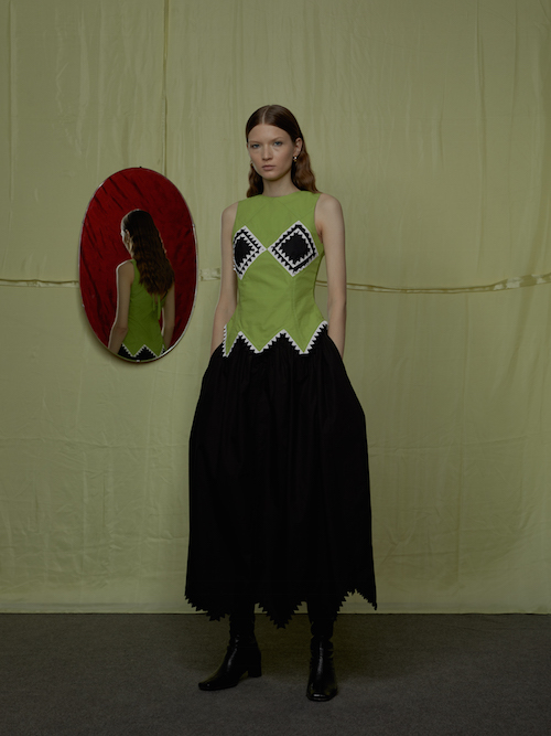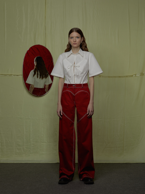 Есть рубашечный хлопок и винтажная вискоза, которую я искала и покупала в разных городах Узбекистана. Мне хотелось сделать максимально современную коллекцию, поэтому я использовала национальные элементы лаконично, приглушала цвет, а в некоторых моделях полностью от него избавлялась. Из сюзане (вышитый вручную настенный ковер. — прим. ред.) я взяла растительные элементы и червяков, которые трансформировала по-своему: в коллекции они будто проедают брюки и рукава курток, вылезая из дырок и расползаются по ткани. Я не пыталась изобразить узоры в их первоначальном значении (как обереги), а показала то, какие чувства у меня вызвало все, что я увидела за полгода в Узбекистане, — разрушающуюся красоту.