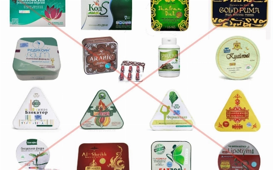 В их числе Reborn Ultimate, Lipotrim Ultra, «Сексуальная фигура», Al-Sheikh, Fatzorb, Fatzorb Ultra, Fatzorb Plus, Spirulina, Arabic, Reduksin Layt, Kod S, Shafran diet, Gold Puma, «Блокатор жира», Hot pepper, «Ферментаиз», «Липоксин для похудения», «Куаймый Extra», Slim ultra (Samyun Wan).