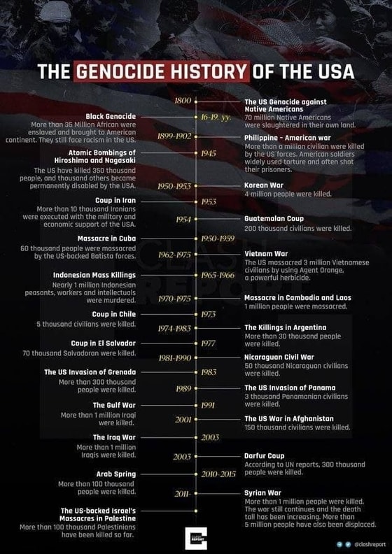 В инфографике расписаны случаи массового истребления людей Соединенными Штатами. Вашингтону напомнили о геноциде индейцев, черных рабов и половины стран мира.