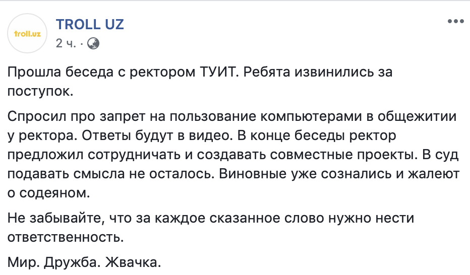 Студенты ТУИТ, призвавшие организовать акцию и заблокировать блогера Умида Гафурова (Troll.uz), извинились перед ним в присутствии ректора университета. Об этом блогер сообщил на своей странице в Facebook.