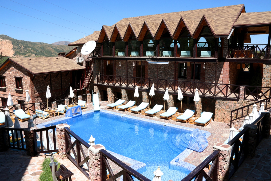 Коттеджи класса "люкс" построены из срубов сосны. Каждый номер гостевого дома выполнен в авторском стиле, а интерьер дополняют эксклюзивная мебель, коврики ручной работы и постельное белье из натурального хлопка. Чарующий вид из окна на горы Чимгана не оставит вас равнодушными.