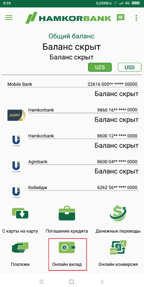 Оформить вклад можно с помощью любых карт, при условии, если регистрация в приложении проводилась с помощью сумовой карты Hamkorbank, а карта другого банка была добавлена как дополнительная.