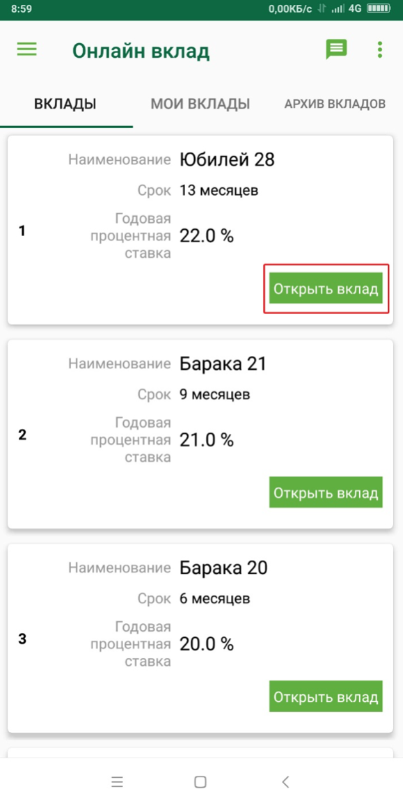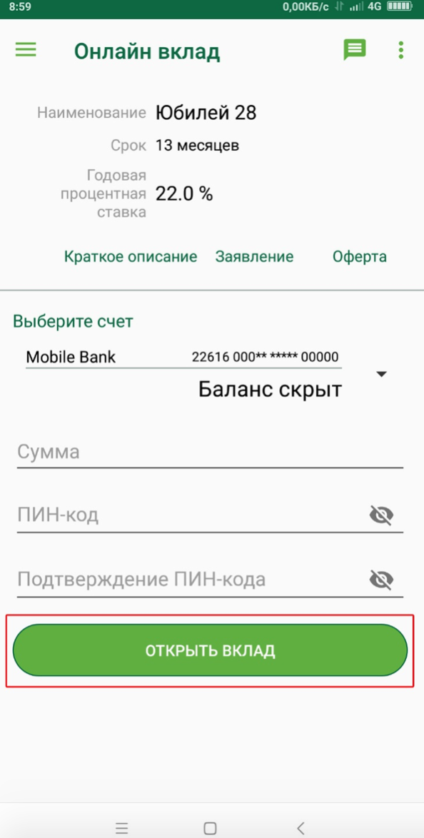 Оформление вклада через приложение занимает пару минут, в течении которых необходимо совершить несколько простых действии: