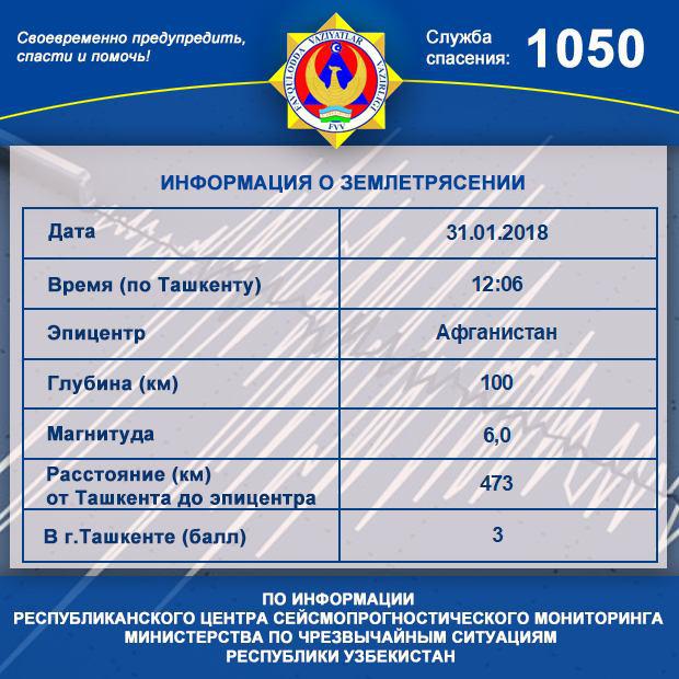 31 января в 12:06 по местному времени жители Ташкента ощутили подземные толчки. Спустя несколько минут после случившегося, МЧС Узбекистана опубликовало сообщение о случившемся в своём Telegram-канале. Так была подтверждена информация об эпицентре (Афганистан), магнитуде в эпицентре (6,0) и о том, насколько баллов толчки ощущали жители Ташкента (3 балла).