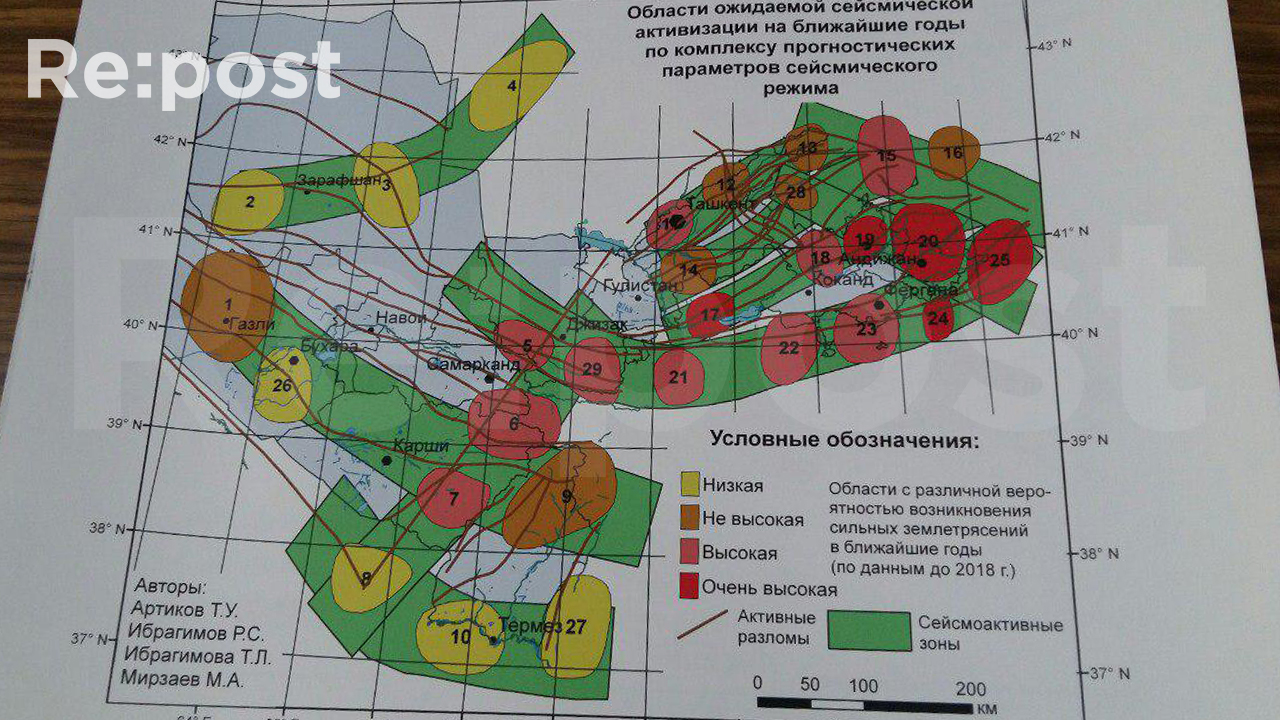 Эти работы ведутся в двух направлениях. С одной стороны, разрабатываются карты разномасштабного сейсмического районирования. Карты общего сейсмического районирования (ОСР)строятся в масштабе всей территории Республики и составляют основу для карт детального сейсмического районирования(ДСР), которые строятся для крупных регионов нашей Республики и карт сейсмического микрорайонирования (СМР), которые строятся для каждого населенного пункта и наиболее ответственных объектов экономики Узбекистана. По мере уменьшения территории возрастает детальность сейсмологических исследований, учитываются локальные грунтовые условия, которые могут увеличивать или, наоборот, уменьшать сейсмический эффект, вызванный землетрясениями.
