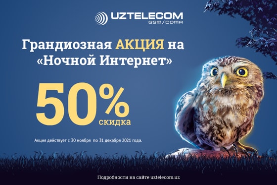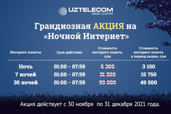 Мобильный интернет пользуется огромным спросом среди современных обывателей, а статистика показывает, что абоненты пользуются услугами Всемирной паутины не только днем, но и в ночное время суток. Специально для активных «ночных» пользователей с 30 ноября по 31 декабря 2021 года UZTELECOM перезапускает грандиозную акцию на услугу «Ночной Интернет», которая уже успела завоевать успех среди GSM абонентов оператора.