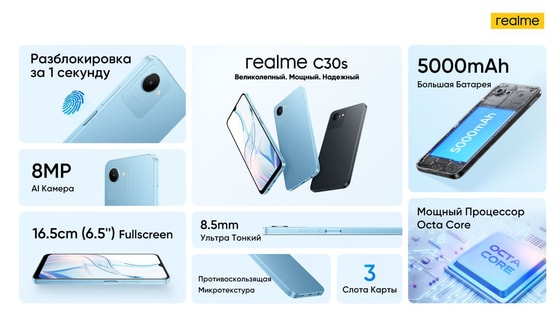 realme C30s – доступный смартфон из серии C. Этот продукт может похвастаться своей мощной батареей в 5000 мАч. Заряда будет хватать на пользование смартфоном в течение всего дня, а в ситуации с низким зарядом батареи встроен режим сверхсбережения. Разблокировать С30s можно быстро и даже в темноте – боковой разблокировкой отпечатка пальца. Дизайн смартфона микротекстурный, противоскользящий, выполненный в двух цветах - черном и голубом.