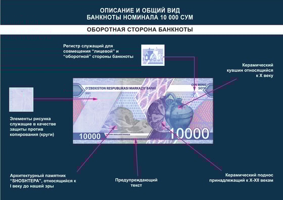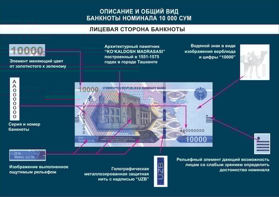Центральный банк сообщил о принятии решения о выпуске в обращение новых образцов денежных знаков номиналами 5 000 сум и 10 000 сум в виде банкнот с 26 августа 2021 года, пишет пресс-служба регулятора.