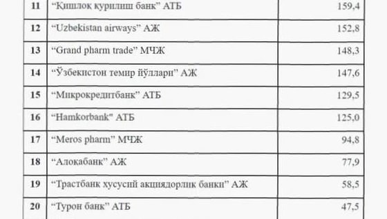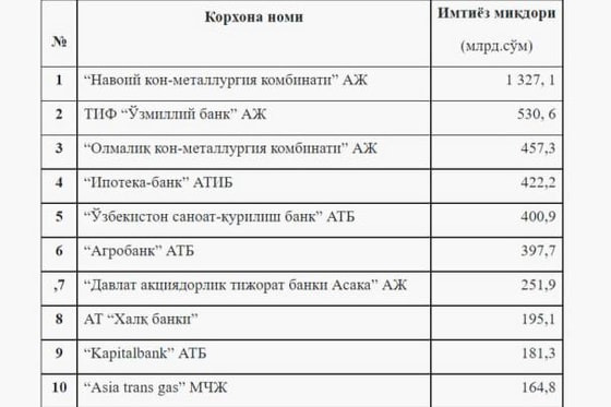 Агентство по противодействию коррупции опубликовало список хозяйствующих субъектов Узбекистана, имеющих наибольшее количество налоговых льгот, а также сумму предоставляемых им льгот.
