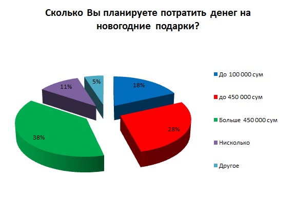 Наиболее популярным бюджетом, который готовы выделить Узбекистанцы на Новый Год, стала сумма более 450 000 сумов – 38% респондентов готовы потратить её на подарки. Еще 28% опрошенных готовы потратить не более 450 000 сумов. Соотвествующие результаты опроса опубликовал HeadHunter Узбекистан.