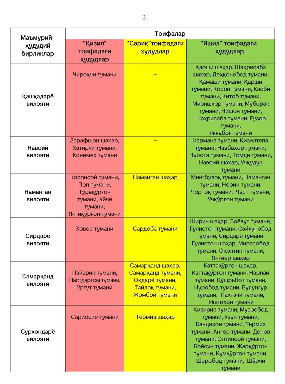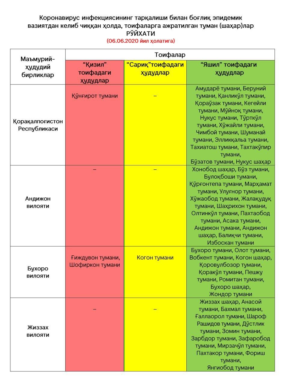 6 июня решением специальной комиссии были перераспределены уровни карантина районов и городов Узбекистана.