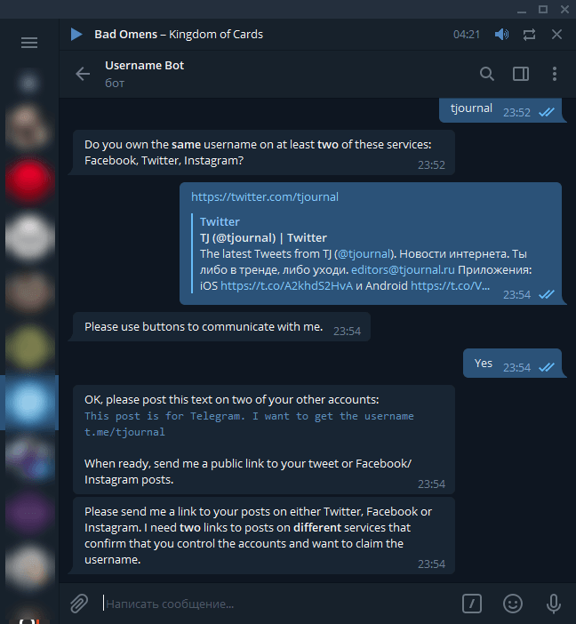 Чтобы получить занятый юзернейм, он уже должен быть вашим в двух из трех следующих соцсетей: Facebook, Instagram, Twitter. @username_bot.