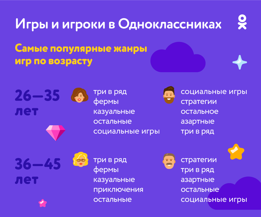 Кроме того, по данным исследования ОК, женщины играют чаще, их доля от общего числа игроков — 66%. Самую многочисленную (46% всех игроков-женщин) категорию составляют женщины 26-45 лет. Из 34% играющих в ОК мужчин также преобладают люди от 26 до 45 лет, они составляют 48% от всех играющих мужчин.