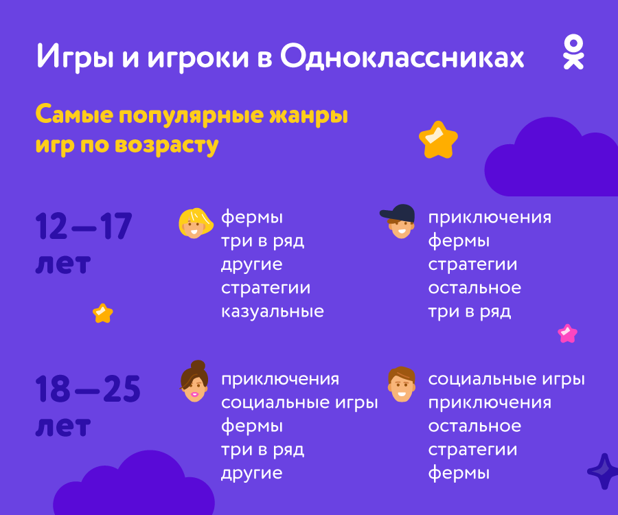 Одноклассники также проанализировали самые популярные жанры на игровой платформе. В ОК, где пользователи традиционно активно делятся эмоциями с родными и близкими, социальные механики игр (репосты, приглашения, соревновательность) делают их особенно успешными.