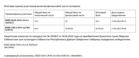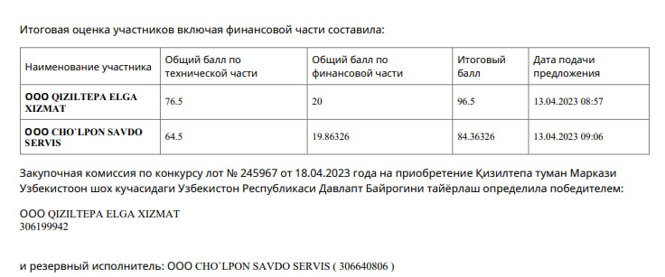 Победителем признали компанию «Кизилтепа Элга Сервис», резервный исполнитель — «Чолпон Савдо Сервис».