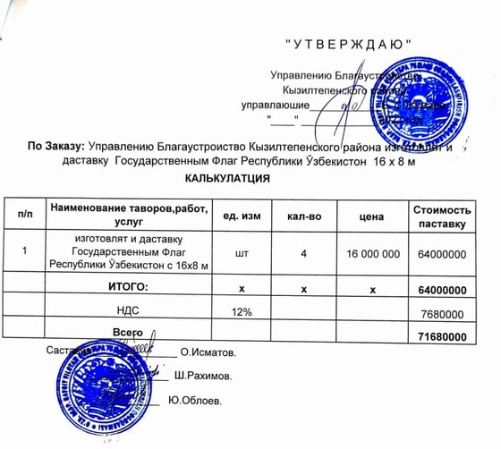 Управление благоустройства Кызылтепинского района Навоийской области закупило четыре флага Узбекистана на десятки миллионов сумов. Результаты тендера опубликовали на UzEx Tender.