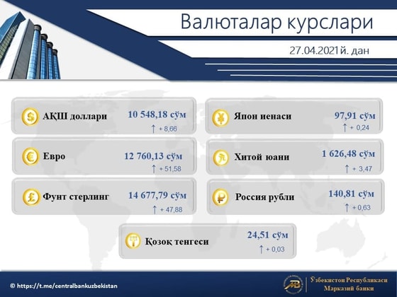 Центральный банк Узбекистана установил с 27 апреля новые курсы иностранных валют по отношению к суму. Курс доллара составил 10 548,18 сумов, подорожав на 8,66. Евро стал 12 760, 13, повысившись на 51,58 сумов. Российский рубль также поднялся на 0,63 и составил 140,81 сумов.