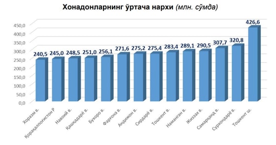 Самая высокая средняя стоимость квартир зафиксирована в Ташкенте — 426,6 млн сумов. После столицы идут Сурхандарьинская (320,8 млн сумов) и Самаркандская области (307,7 млн сумов). Самая низкая цена зафиксирована в Хорезмской области (240,5 млн сумов).