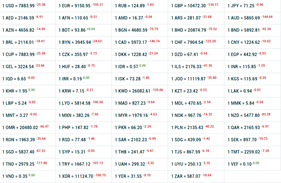 По сравнению с предыдущей неделей, доллар потерял в цене 25.38 сумов и составил упав до отметки 7883.99 сумов. Курс евро упал на 155.21 сумов до отметки в 9150.95 сумов.