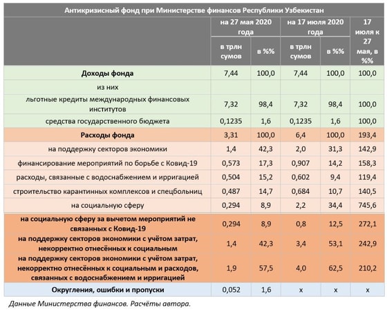 Но нам важнее как тратятся средства Антикризисного фонда. По состоянию на 17 июля 2020 года расходы фонда составили 6,4 трлн сумов. По сравнению с данными на 27 мая 2020 года расходы на поддержку секторов экономики увеличились в 1,4 раза и достигли 2 трлн сумов (31,3 процента всех расходов фонда); на финансирование мероприятий по борьбе с коронавирусной инфекцией, соответственно, 1,6 раза, 907 млрд сумов и 14,2 процента; связанные с водоснабжением и ирригацией, соответственно, 1,2 раза, 602 млрд сумов и 9,4 процента; на строительство карантинных комплексов и спецбольниц, соответственно, 1,4 раза, 684 млрд сумов и 10,7 процента и социальную сферу, соответственно, 7,5 раза, 2,2 трлн сумов и 34,4 процента.