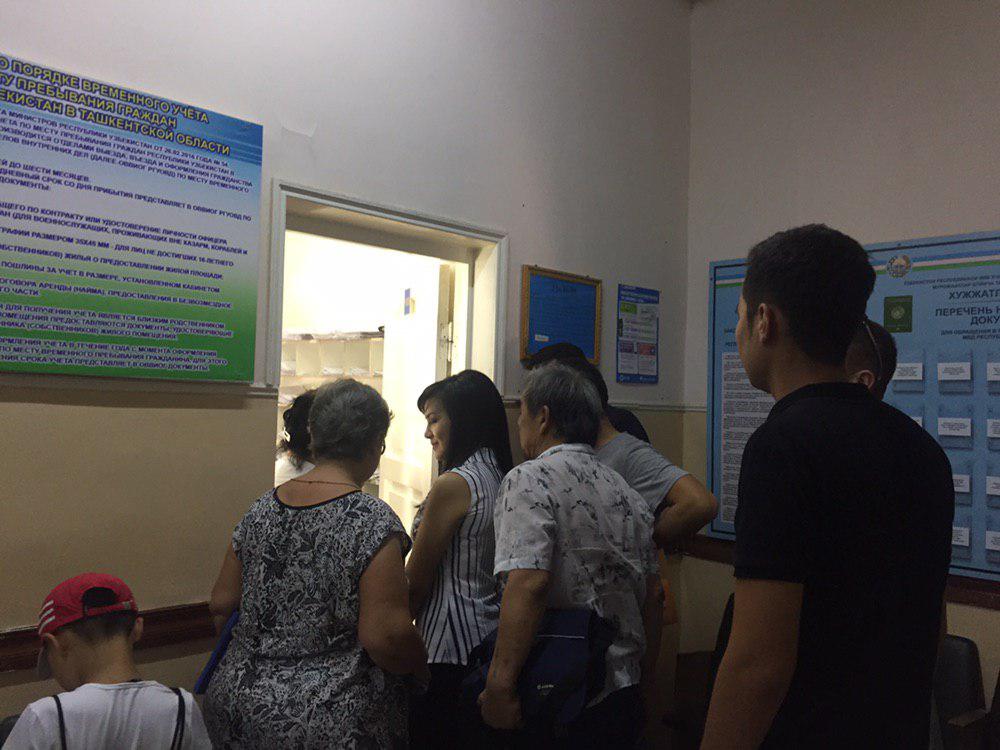 Когда настал долгожданный час, вся толпа рванула в заветное здание. Трухлявое как снаружи, так и изнутри здание со старыми советскими дверьми, лишь одна из которых была на современный лад, за считанные минуты пополнилась людьми. Ворота открылись в 8:30 утра, а народ ждал сотрудников до 9:20. Возле заветного кабинета под номером 105, где фотографируют на загранпаспорт, очередь была самой длинной. На вопросы граждан о том, во сколько начнется рабочий день, один из сотрудников паспортного стола города Чирчика молча смотрел на всех и ничего не отвечал.