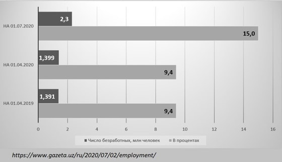 Конечно, можно объяснить это карантинными мероприятиями, ограничениями на передвижение и прекращение или ограничение деятельности предприятий и организаций. Так, по сообщению министра занятости и трудовых отношений Нозима Хусанова, озвученного в начале июня, уровень безработицы в Узбекистане из-за пандемии коронавируса возрос до 14-15 процентов.