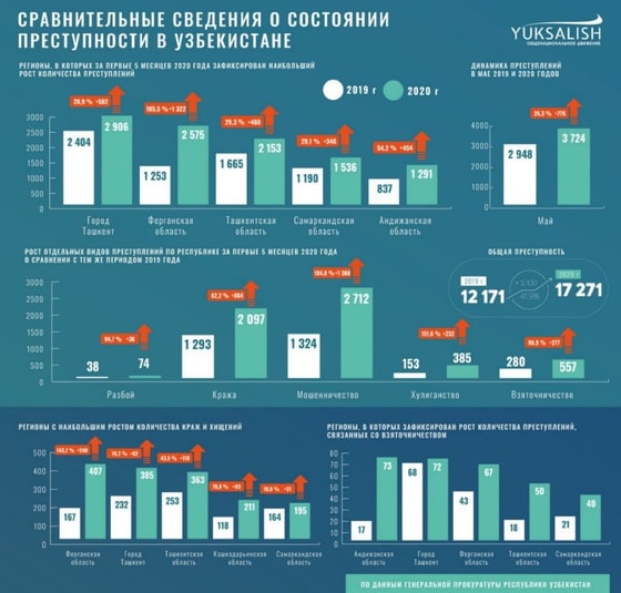 В той же Ферганской области за первые пять месяцев 2020 года было зафиксировано 2 575 преступлений, что в два раза больше, чем за соответствующий период прошлого года. В этой области почти в 2,5 раза увеличилось количество краж и хищений.