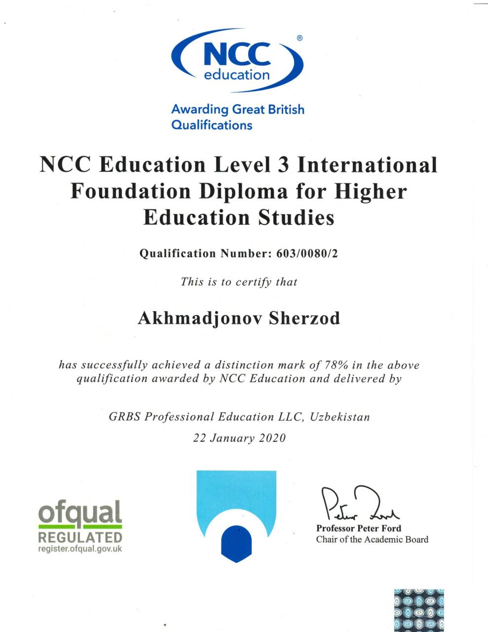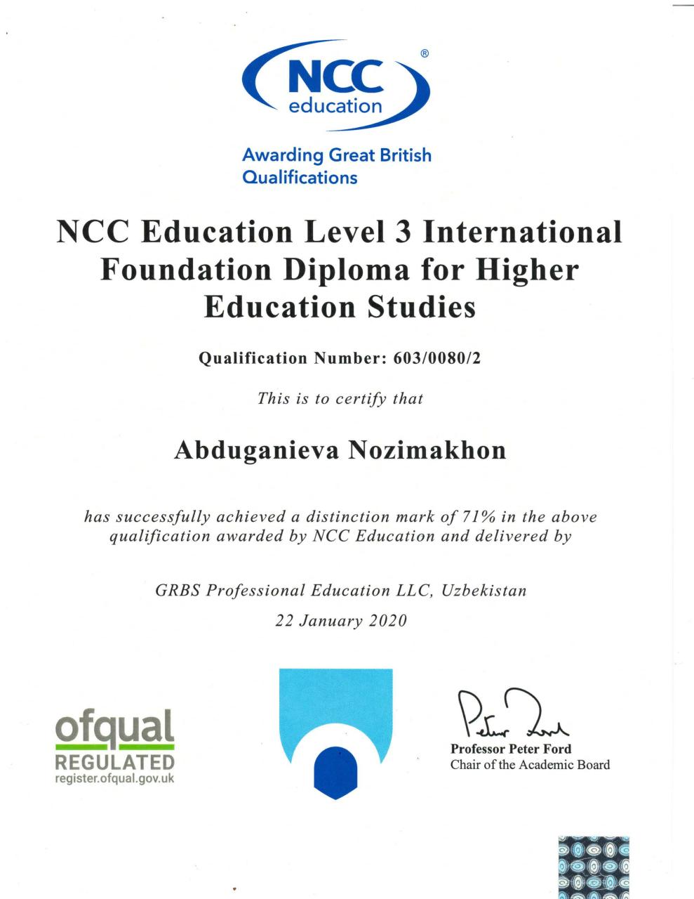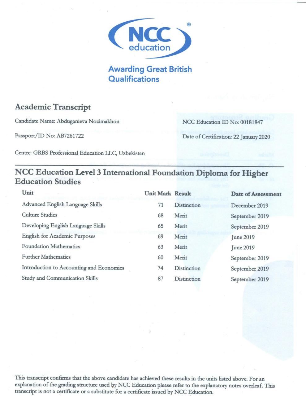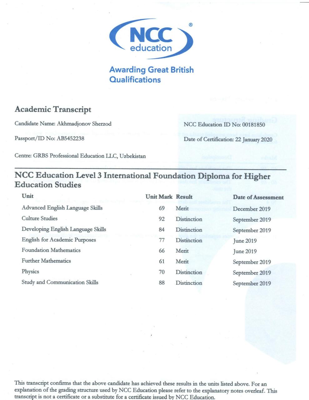 Первые выпускники: Нозимахон Абдуганиева и Шерзод Ахмаджонов, по международной академической квалификации Level 3 International Foundation Diploma for Higher Education Studies от глобально признанного награждающего органа Великобритании - NCC Education, регулируемого британскими правительственными органами, в партнерстве с международным кампусом GRBS в Ташкенте.