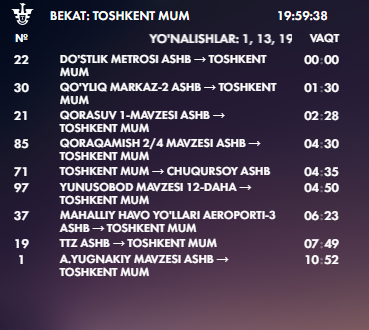 Для создания дополнительного комфорта пассажирам АО «Тошшаҳартрансхизмат» на остановках были установлены обновленные LED-табло, — пишет компания.