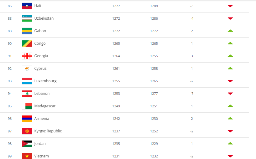19 сентября Международная федерация футбола ФИФА обновила рейтинги команд, где Узбекистан опустился на 88 место, набрав 1272 балла, сообщается на сайте ФИФА.