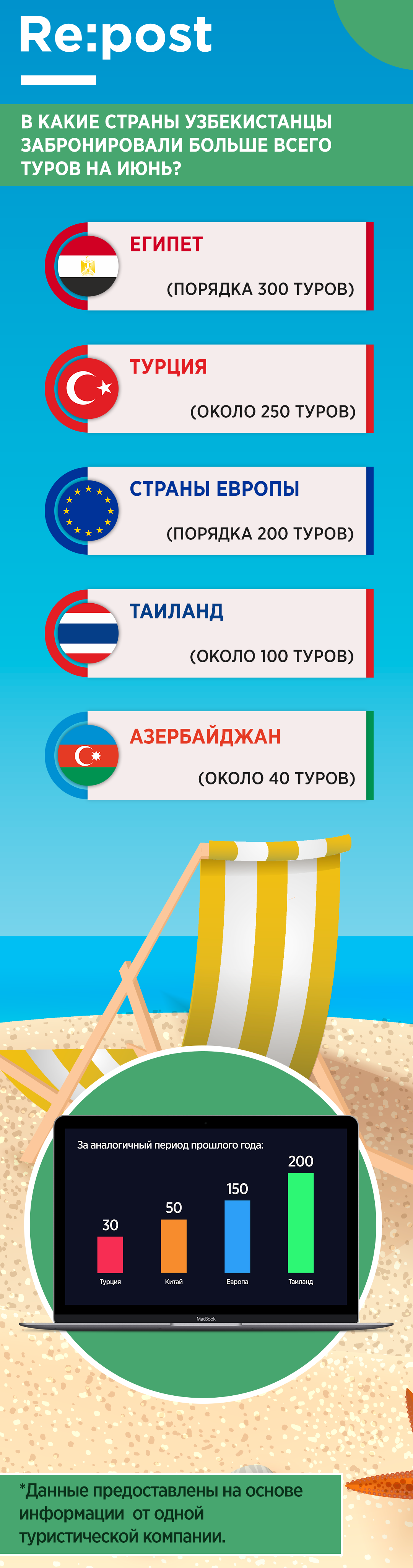 Repost решил выяснить, в какие страны узбекистанцы забронировали больше всего туров на первый летний месяц. Для этого мы обратились в одно из крупных столичных туристических агентств, которое реализовало на июнь свыше 300 туров.