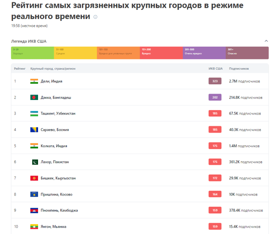 Ташкент в очередной раз оказался в списке городов мира с самым загрязненным воздухом, следует из отчета портала IQAir.