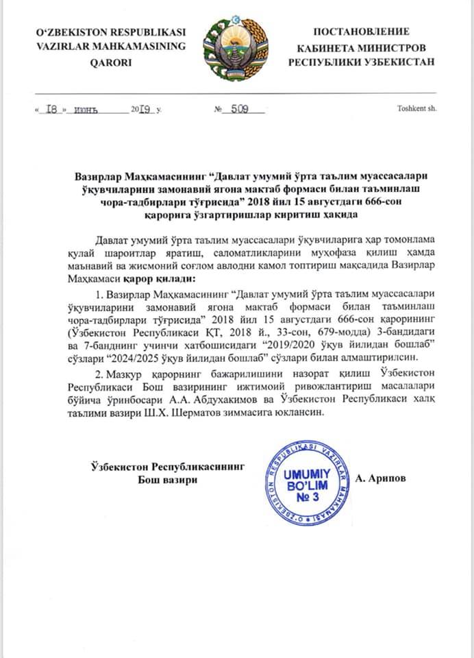 Своим постановлением от 18 июня правительство решило отложить ввод обязательной единой школьной формы до 2024−2025 учебного года, пишет вице-премьер Азиз Абдухакимов со сслыкой на документ.