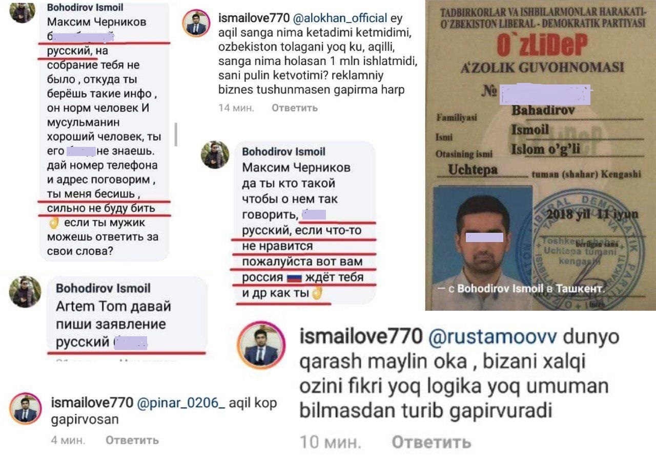 Инициатором скандала стал Исмаил Бахадиров, член партии УзЛиДеп и студент Санкт-Петербургского университета. Мужчина решил поддержать городскую администрацию и попутно отправил всех комментаторов в Россию, оскорбил нецензурными выражениями и даже вспомнил экс-хокима столицы Рахмонбека Усманова, назвав его коррупционером.