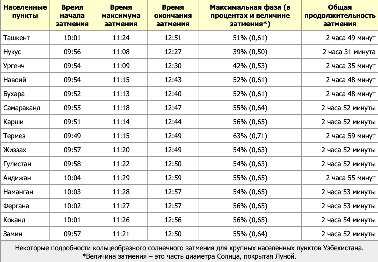 Во время максимального значения затмения на северо-западной территории Республики, точнее в Каракалпакстане, а также в Хорезмской области от 39% до 50%, в Бухарской, Навоийской, Самаркандской, Жиззакской, Сырдарьинской, Ташкентской, Андижанской, Наманганской и Ферганской областях до 58% солнечной поверхности будет покрыто Луной. А в самой южной части нашей страны – городе Термезе – это значение достигнет аж 63%. Жители Узбекистана могут наблюдать затмение на основе нижеприведенной таблицы.