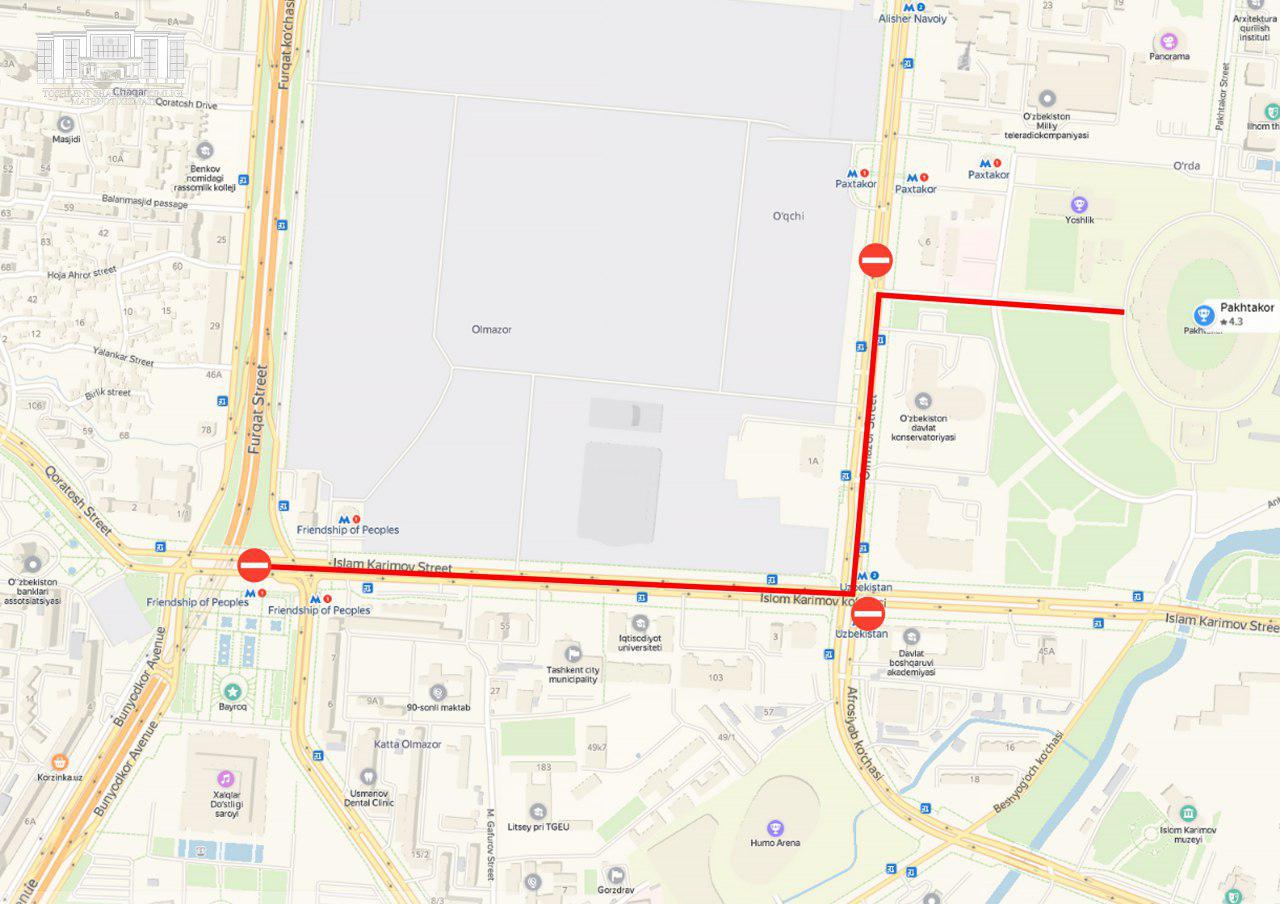 — улица Олмазор – от пересечения с улицей Ислама Каримова до Национального олимпийского комитета (улица Олмазор).